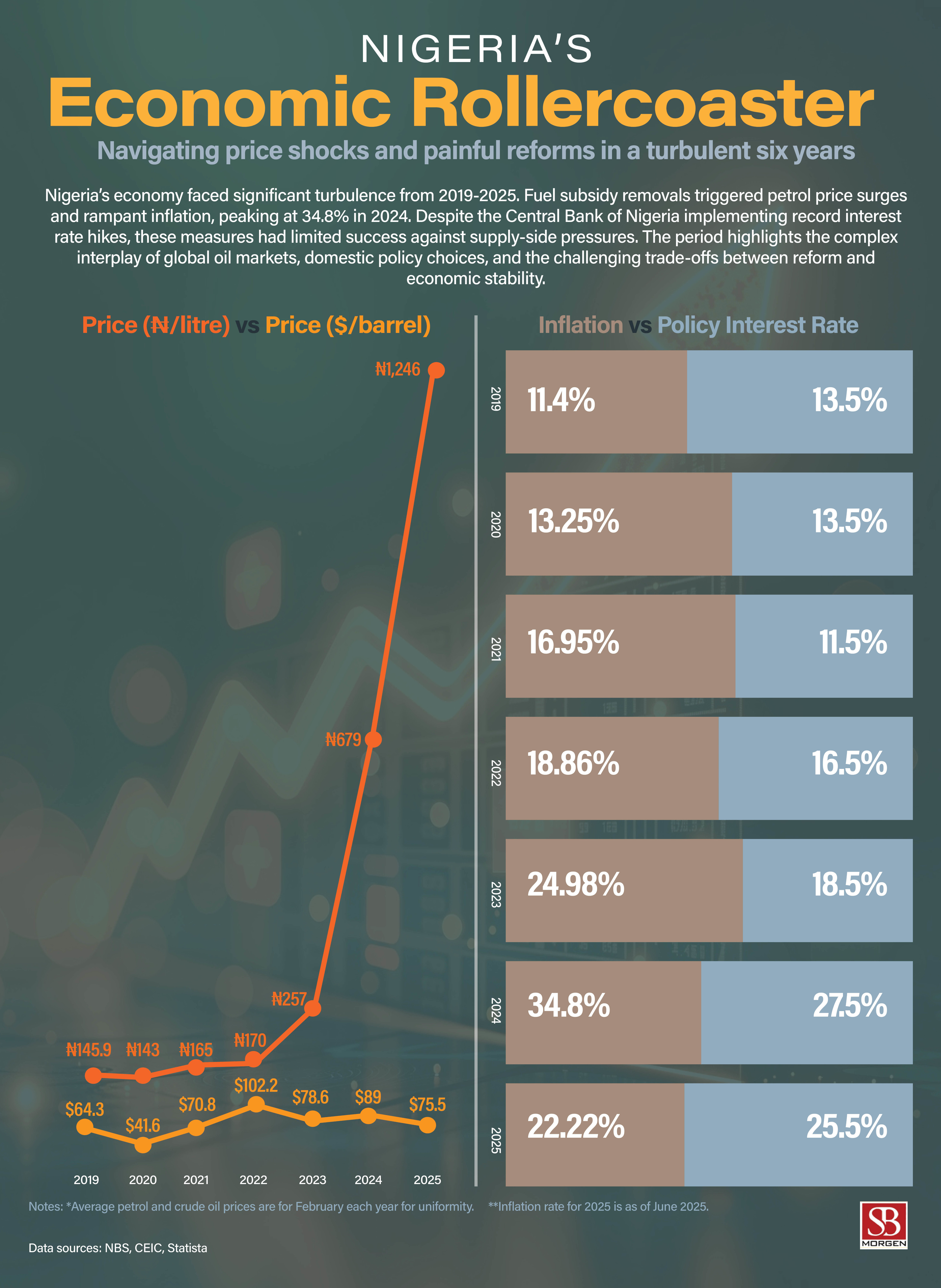 In June 2025, Nigeria’s oil revenue fell to ₦4.57 trillion—a 23.9% decline from May—due to volatile global oil prices driven by geopolitical tensions and uncertain OPEC+ production strategies, according to NNPC data. Despite this, Nigeria's economic landscape saw key developments: the Central Bank retained the Monetary Policy Rate at 27.5% to manage persistent core inflation, while the Senate approved President Tinubu’s borrowing plan, including $21.5 billion in external loans and a ₦757.98 billion bond to address pension liabilities. The naira remained stable officially but weakened slightly in NFEM. Nigeria’s external reserves rose to $40.11 billion, supporting foreign exchange stability.