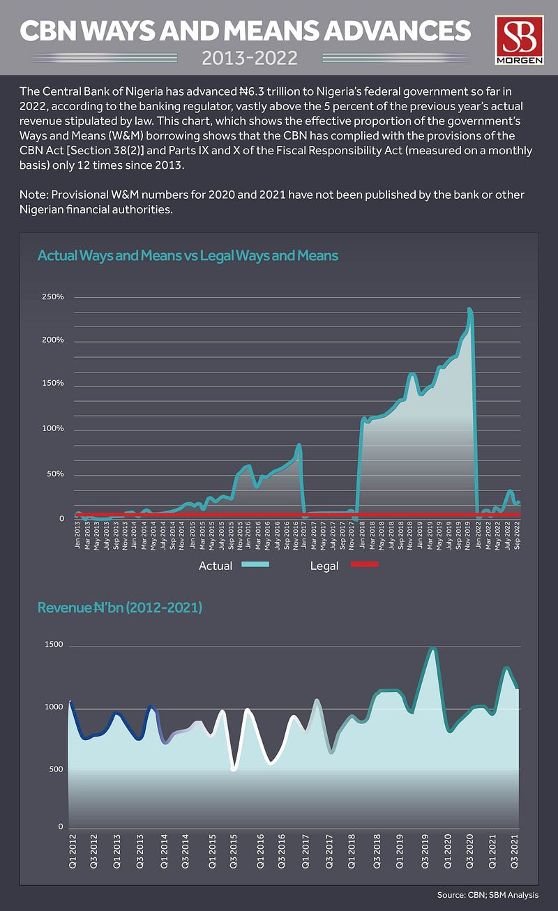 The Central Bank of Nigeria (CBN), in the year, ended 31 December 2022, advanced a ₦23.18 trillion loan to the federal government under its “Ways and Means” policy, exceeding the statutory limit by ₦22.9 trillion. Section 38 of the CBN Act limits the advance that the Bank can grant in any year to five percent of the actual government’s revenue in the preceding year. The 2022 financials also reported borrowing $7.5 billion from US banks JP Morgan and Goldman Sachs. The CBN also entered into 30-day forward contracts totalling ₦3.15 trillion in 2022 with undisclosed counterparties.