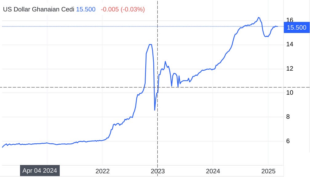 Ghana's Cedi depreciates 19% annually from 2022-2024 amid economic instability.
