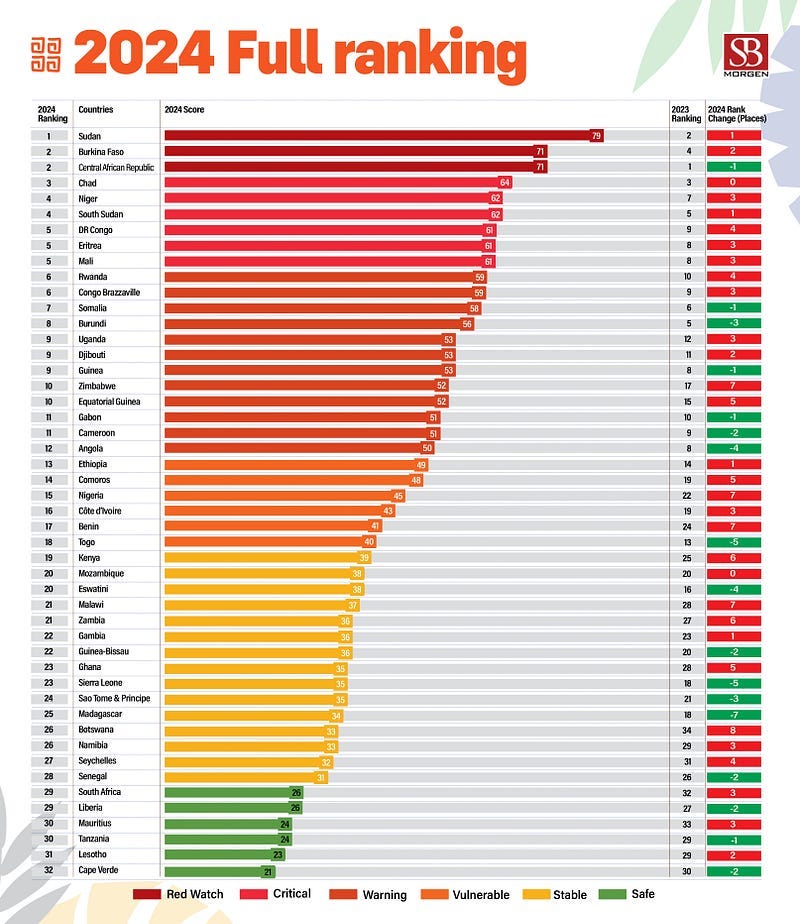 While Somaliland does not feature in the Aciri — it is not internationally recognised as a country by anyone just yet — the leadership change, with opposition leader Abdirahman Cirro defeating incumbent President Muse Abdi, demonstrates the region’s commitment to democratic principles. The elections, which took place some two years after it was originally scheduled, having been delayed due to a lack of funding, came against the backdrop of regional tensions following the statelet’s attempt at gaining international recognition through unilateral deals with Ethiopia and the United Arab Emirates through port and naval deals.