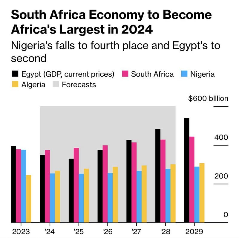 Nigeria’s economy, which ranked as Africa’s largest in 2022, is set to slip to fourth place this year after a series of currency devaluations, International Monetary Fund (IMF) forecasts show. As reported by Bloomberg, the IMF’s World Economic Outlook estimated the country’s gross domestic product at $253 billion based on current prices this year, behind North African powerhouses Algeria at $267 billion, Egypt at $348 billion, and South Africa at $373 billion. The report added that South Africa will remain the continent’s largest economy until Egypt reclaims the mantle in 2027.