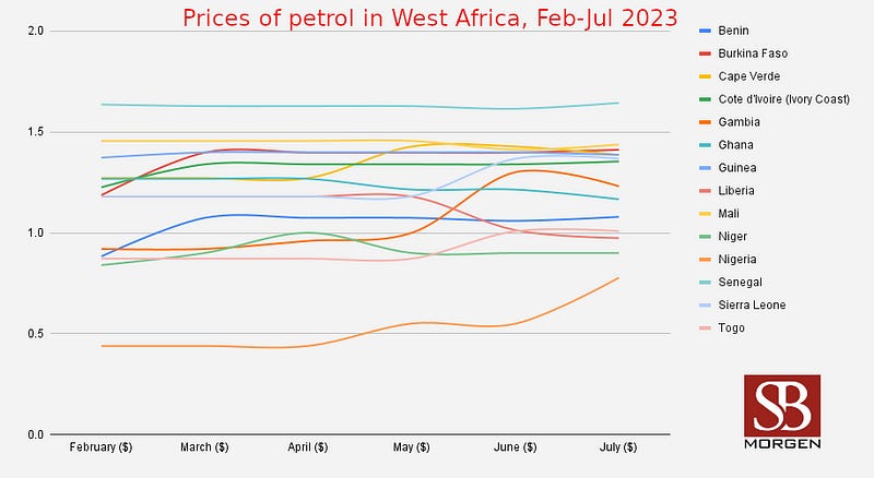 In Q2, West African monthly petrol imports dropped 56%, Refinitiv Eikon reported. June shipments from Amsterdam-Rotterdam-Antwerp to West Africa fell to 629,000 tonnes from 895,000 tonnes last year; July loadings dropped to 627,000 tonnes from 1.5 million tonnes in 2022. Declining demand is evident, attributed partly to the removal of Nigeria’s petrol subsidies on 29 May. Nevertheless, foreign refiners from Europe, the Middle East and Russia are competing to boost refined petrol exports to Nigeria. Last week, The Punch reported that Russian petrol imports surged 84% in the past year.
