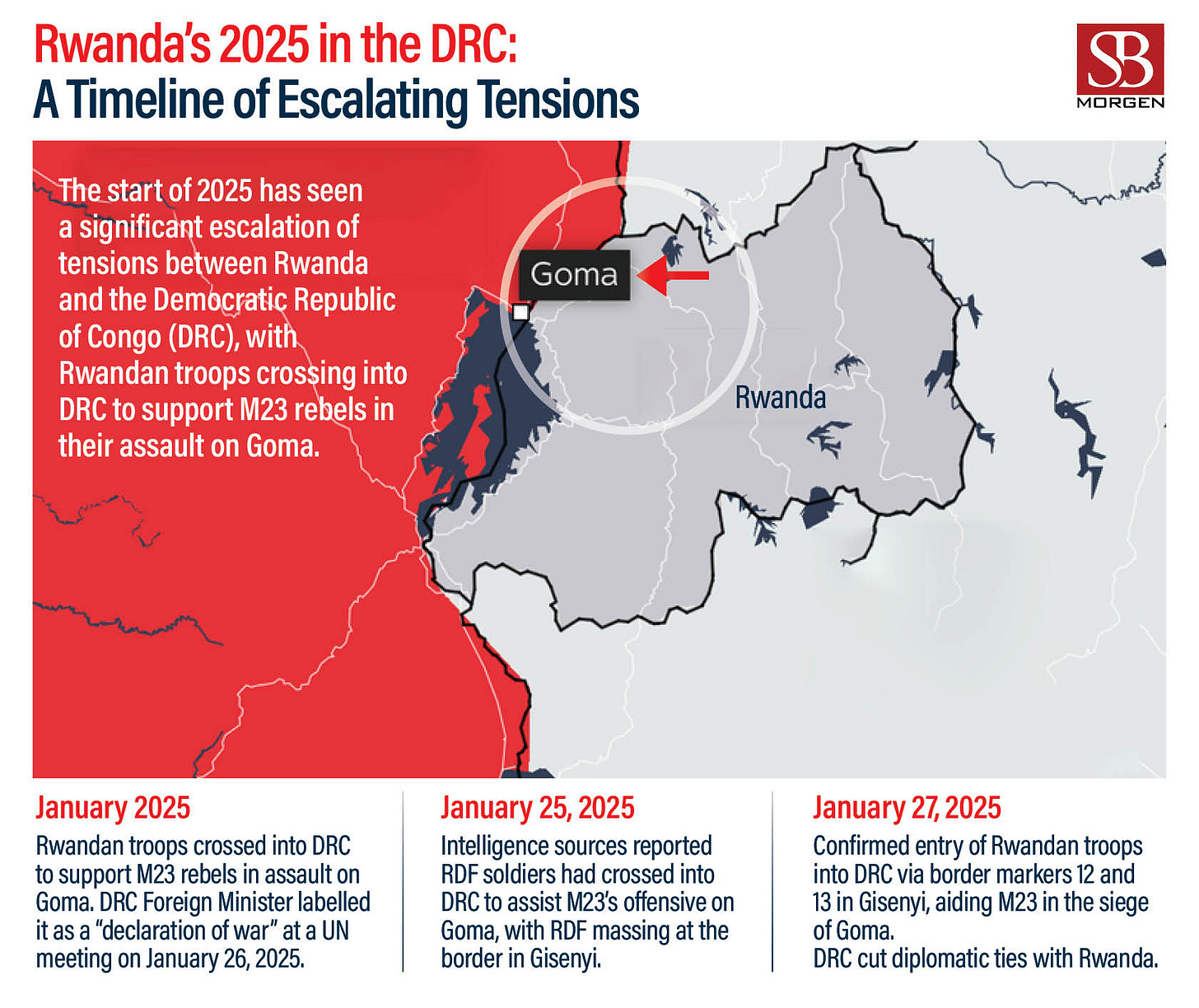 The conflict has drawn international attention, with UN Secretary-General António Guterres engaging in talks with the presidents of the DRC and Rwanda and the UN Security Council convening an emergency meeting. A public spat between Rwandan President Paul Kagame and South African President Cyril Ramaphosa further heightened tensions, with Ramaphosa condemning the deaths of South African troops deployed in the DRC and Kagame accusing him of distorting private conversations. Kagame later offered assurances of safe passage for South African forces, signalling a tentative de-escalation.