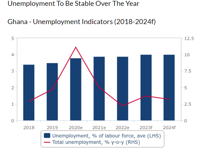 Ghana is currently battling with a significant economic challenge, facing high unemployment rates, double-digit inflation, and a depreciating currency against major trading currencies like the US dollar. In December 2023, the inflation rate surpassed 23%, while the unemployment figures released by the Ghana Statistical Service for the third quarter of 2023 revealed a worrisome rate of more than 14%. This represents a threefold increase in Accra’s unemployment rate compared to a decade ago, positioning it as one of the worst in the ECOWAS region, surpassing counterparts like Nigeria, Ivory Coast and Senegal, which all maintain single-digit unemployment rates. According to the Ghana Statistical Service, the average unemployment rate for the first three quarters of 2023 stood at 14.7%, with females experiencing consistently higher rates than males. The gender gap in unemployment widened in 2023 compared to 2022, driven by a sharp increase in female unemployment between the fourth quarter of 2022 and the first quarter of 2023. As more individuals migrate to urban centres like Accra and Kumasi in search of employment opportunities, the regions of Greater Accra and Ashanti consistently record unemployment rates higher than the national average. The youth unemployment rate in Ghana is nearing 20%, with a concerning statistic indicating that 22.3% of individuals experiencing unemployment between the first quarter of 2022 and the third quarter of 2023 had completed tertiary education. In fact, of the 540,000 individuals who transitioned from being outside the labour force to unemployment status between the fourth quarter of 2022 and the first quarter of 2023, over 75% remained unemployed. The latest Food Security Update by the World Bank revealed that approximately 1.96 million Ghanaians are facing acute food and nutrition insecurity, primarily due to high prices and post-harvest losses. While food may be available, the pressing question arises regarding whether the ordinary Ghanaian, grappling with unemployment and double-digit inflation, can afford it. As the 2024 presidential and parliamentary elections approach, the escalating number of unemployed individuals in Ghana raises the critical question of whether they will be promised unemployment benefits similar to those in Nigeria or opportunities for job creation.
