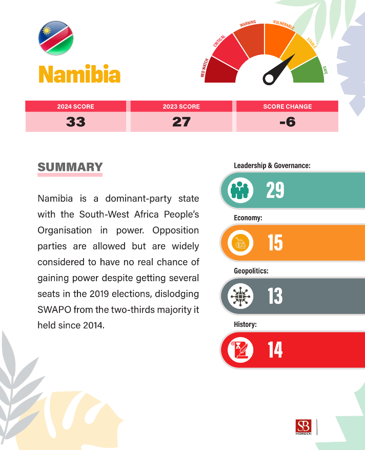 The election of Netumbo Nandi-Ndaitwah as Namibia’s first female president is a landmark event in the country’s political history, marking a critical juncture in its governance dynamics. However, as highlighted in SBM’s 2024 Africa Country Instability Risk Index (ACIRI), the broader context underscores significant undercurrents of political and societal instability that are worth exploring. Namibia is currently rated stable at 33% in the 2024 edition of SBM’s Africa Risk framework. Nandi-Ndaitwah’s win is unique in many ways, apart from its feat of electing a female president. Namibia’s political landscape is dominated by the South-West Africa People’s Organisation (SWAPO), which has maintained unbroken rule since independence in 1990. The party’s liberation credentials have historically translated into broad electoral support, often resulting in supermajorities. However, recent years have seen a decline in this dominance. For instance, in the 2019 elections, SWAPO lost its two-thirds majority in parliament for the first time since 2014, signalling growing discontent among the electorate. The -6 score change in Namibia’s ACIRI rating, despite its overall “stable” designation, reflects these cracks in its political edifice. A dominant-party system often breeds complacency, corruption, and a lack of accountability. This is evident in opposition gains and their increasing boldness in challenging SWAPO’s entrenched dominance. SWAPO’s relatively declining popularity following corruption scandals led analysts to predict a run-off–a prediction she beat by leading with a comfortable majority. With 65.57% of the vote counted, early results released Tuesday by the election commission showed the governing party candidate, 72-year-old Nandi-Ndaitwah, leading with 54.82%. Also, the anti-ruling party sentiment expected to taint SWAPO’s fortunes did not materialise. Voters vote separately for members of the National Assembly, and with 66.4 percent of the votes tallied, SWAPO led the ballot with 56.38 percent. Independent Patriots for Change was running at 19.23 percent. Her victory bucked the trend visible in Southern Africa’s elections this year, where anti-incumbent sentiments have either swept a long-lasting ruling power from office (Botswana) or forced it into a coalition for the first time (South Africa), or led to a hotly contested stalemate, leading to instability (Mozambique). If her win is confirmed following the opposition’s planned legal challenge, she will have to deal with the corruption of party members in government. She would also be faced with a sluggish economy. A few days after the poll, the Bank of Namibia (BoN) revised its 2024 economic growth forecast to 3.5% from the previous estimate of 3.1%. This upward revision is attributed to improved domestic conditions despite global economic headwinds and ongoing drought. That revision is still a shortfall from the 2023 numbers. The country’s economy grew by an estimated 4.2% in 2023, down from 5.3% in 2022 due to weak global demand for diamonds and an 18% contraction in agriculture caused by drought. The AFDB projected that real GDP would decline to 3.3% in 2024 and 2025 owing to anticipated weak global demand for diamonds and contraction in agriculture. Netumbo Nandi-Ndaitwah’s ascent to the presidency represents a dual narrative. On one hand, it is a victory for gender representation in a region where female political leadership remains rare. Her presidency could inspire broader participation of women in governance and set a precedent for gender inclusivity in Namibia and the region. On the other hand, her election continues SWAPO’s grip on power, raising questions about whether the party can rejuvenate itself or remain mired in old patronage systems. The court challenge will test Namibia’s judiciary and electoral commission, which are crucial for upholding democratic norms. The broader instability risk also ties into economic factors. Namibia’s reliance on extractive industries, persistent inequality, and youth unemployment could magnify dissatisfaction with SWAPO’s governance. If these socio-economic challenges remain unaddressed, political discontent could deepen, regardless of SWAPO’s historical dominance. Nandi-Ndaitwah’s presidency offers renewal opportunities, but it will require a departure from the status quo. Key focus areas should include strengthening democratic processes to rebuild trust in elections and institutions, addressing unemployment and inequality to foster inclusive growth, and engaging opposition parties and civil society to mitigate polarisation and promote political pluralism. While Nandi-Ndaitwah’s victory is a historic milestone, it does not erase the structural challenges facing Namibia’s political system. SWAPO’s prolonged dominance and allegations of electoral malpractice and socio-economic grievances could strain the country’s stability. Her presidency will determine whether Namibia can address these challenges and maintain its “stable” ranking or risk further declines in indices like ACIRI.