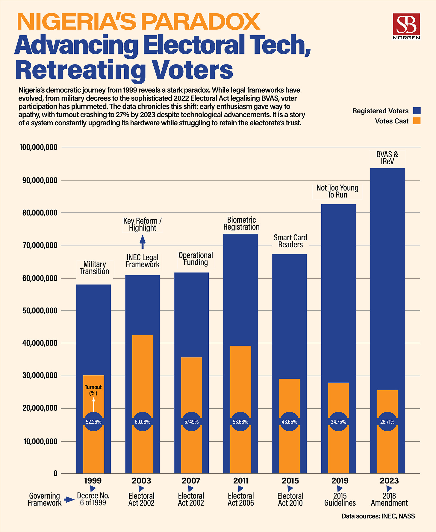 The deeper issue transcends transmission mechanics. Over successive cycles, Nigeria has layered technology onto its voting system, from smart card readers to BVAS accreditation and result portals. Yet turnout has continued to decline. The pattern suggests that technological sophistication alone does not generate democratic participation. Trust does. Process clarity does. Institutional impartiality does.