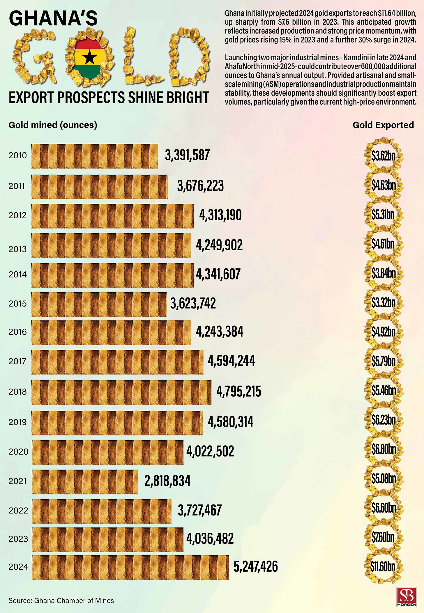 Ghana's position as Africa's largest gold producer (with output reaching 4.2 million ounces in 2023 and projected to hit 5.2 million in 2024) starkly contrasts its paltry domestic benefits. The country's gold exports have surged from $3.6 billion in 2010 to a projected $11.6 billion in 2024 – a 221% increase – yet this wealth remains alarmingly concentrated in foreign hands. While industrial mines like the soon-to-open Namdini and Ahafo North projects (expected to add 600,000 ounces annually) boost production figures, Ghana retains shockingly little: less than 10% of export value reaches national coffers, with mineral royalties stubbornly below $500 million annually.