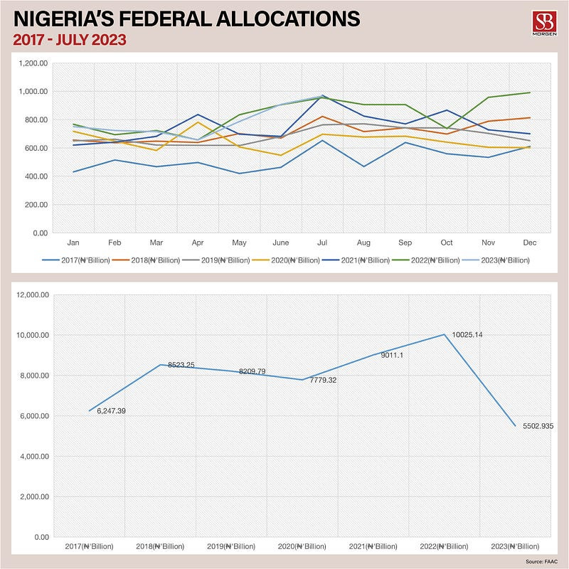 According to the Nigerian Upstream Petroleum Regulatory Commission (NUPRC), Nigeria’s oil output fell by 15.5% to 1.08 barrels per day (bpd) in July 2023. The decline in production appears to have impacted the revenues available to FAAC for sharing. It is annoying that the gains earlier recorded in June have been lost such that Nigeria continues to fail to reap the benefits of high oil prices, especially where there is a clamour for palliatives to ease the pains from recent petrol subsidy removal. A one-off release of palliatives worth ₦5 billion ($5.7 million) to states with an average population of five million people per state is inadequate, especially with the constant rise in inflation. Even if focused on the poorest tier, it cannot offer the basic level of food security. The federal government cannot afford to keep releasing one-off payments to each state. This will drain the treasury and not solve the underlying problem of food insecurity. A sustainable approach is needed. Despite what should be an increase in naira terms due to currency devaluation, a month-on-month reduction in government revenues is worrying. President Tinubu’s campaign touted one of his strengths to be his ability to raise government revenues. Now that ministers have taken office setting this revenue ball rolling is vital. Nigeria has a spending problem — yes. But crucially, it also has a revenue problem. and President Tinubu must find a way, despite the enormous constraints he faces, to solve it. The federal and state governments should focus on identifying sustainable ways to manage inflation by investing in agriculture, removing tariffs on food and alternative energy sources, creating credit purchase systems and improving the agricultural sector’s efficiency rather than engaging in a giveaway that does nothing to bring lasting change, the federal and state governments can build sustainable frameworks that help to create a more stable and prosperous economy for everyone.