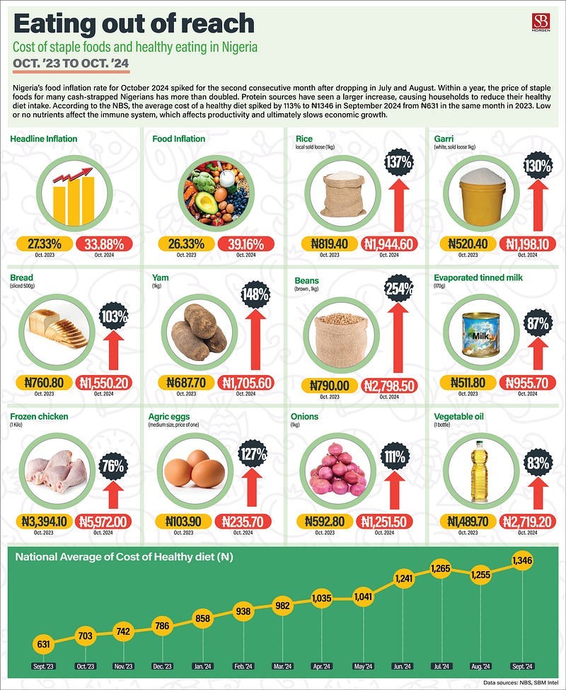 The data shows that food prices have significantly outpaced income growth over the past four years. Insights from our work with the Jollof Index over the last eight years highlight a troubling trajectory. Initially, Nigerians shifted to cheaper substitutes as staple foods became unaffordable amid a steep decline in purchasing power. However, even these alternatives have become too expensive, forcing many to skip meals or reduce the quality and quantity of their food. This shift has led to a rise in hunger and malnutrition. Poor nutrition weakens immune systems, disrupts productivity, and slows economic growth. Protein sources have seen the steepest price increases among five food groups. According to the NBS, the price of 1kg of beans surged by 254% to ₦2,799 in October 2024, up from ₦1,790 a year earlier. 1kg of frozen chicken nearly doubled to ₦5,972, while a piece of Agric egg spiked by 127%. This protein deficiency is already causing stunted growth, particularly among children. Proteins are essential for brain and cognitive development, fostering intelligence and creativity. Families are also cutting back on fruits, with only 38% of households consuming them, according to the NBS. Furthermore, more than one-third of households reported food shortages, especially in June, July, and August. This is notable because inflation dropped in July and August before peaking in September and October, suggesting a disconnect between inflation metrics and actual food accessibility. In recent years, persistent insecurity, supply chain disruptions, climate change, elevated energy prices, floods, weakened naira, and high farm input costs have constrained the agricultural sector’s growth to below 3%. The Farming Early Warning System Network recently predicted further deterioration in food security from November 2024 through May 2025, driven by poor harvest yields. This paints a bleak picture: food production will likely decline further unless policymakers urgently address the root causes of this crisis, including inflation, supply chain inefficiencies, and currency instability. Targeted interventions — subsidies, agricultural investments, and social safety nets — are essential to safeguard nutritional well-being and economic stability. Without decisive action, escalating food inflation will leave more Nigerians unable to afford the most basic human need — food. Tackling this issue must be the government’s top priority.