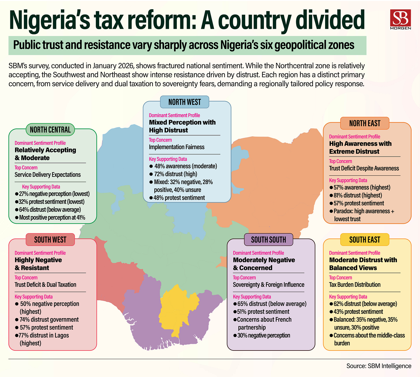 Our core insight is that opposition is not driven by the scale of the fiscal adjustment, which is modest at 1-1.5% of GDP. Instead, resistance is fractured and deeply felt, where enforcement becomes visible. The report uncovers stark regional disparities. In the Southwest, particularly Lagos, high awareness correlates with the strongest resistance (half of respondents have a negative perception of the new law), fueled by concerns over legislative integrity and the perceived burden on the visible middle class. In the Northeast, exemplified by Bauchi, distrust peaks at a whooping four-fifths, heavily influenced by geopolitical suspicion of the partnership with French tax authorities, widely framed as “digital colonialism.”