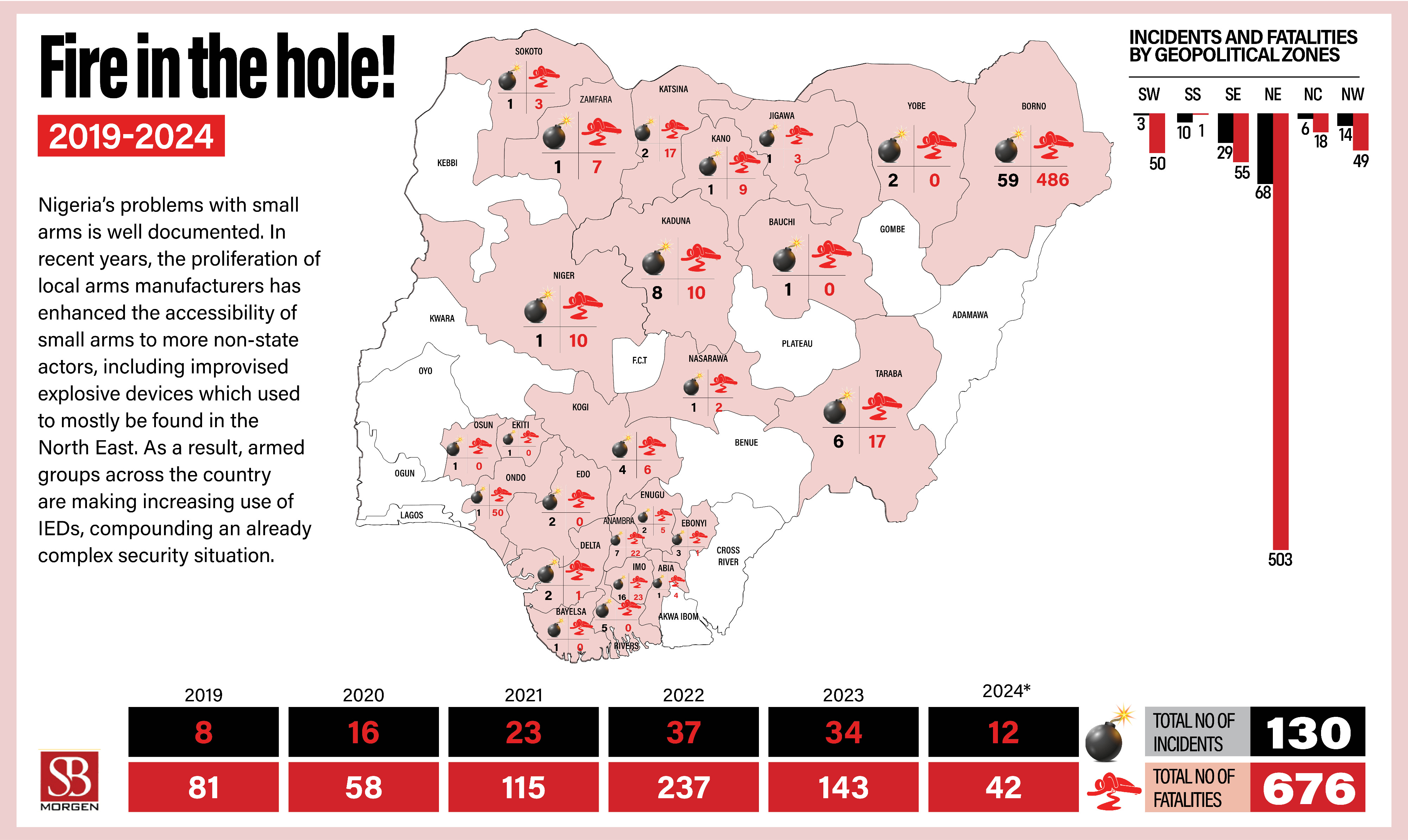 IED blast kills nine in Borno; 43 killed in Benue attacks. Plateau sees 12 dead from herder violence, with six more killed in separate attacks.