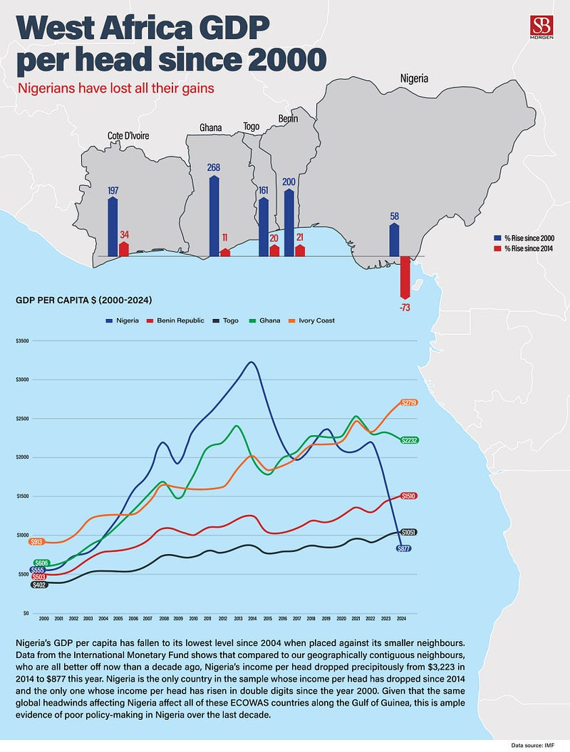 Nigeria’s GDP per capita halved in one year, falling to its lowest since 2004. Earlier in the year, there were expectations that the country would begin to see gains from fiscal reforms, leading the lender to forecast an improved economy. But reality has hit, and the IMF’s projection indicates a decline from 3.1 percent in July and 3.3 percent in April. Nigeria, which ranked Africa’s largest economy in 2022, has slipped to fourth place. This decline is largely due to a precipitous devaluation of the currency against the USD, the currency used to denominate the GDP per capita measure — the exchange rate fell from around ₦700 to over ₦1,700 per dollar. Compared to its immediate neighbours, Nigeria has fared poorly, with this decline beginning in 2014 (when per capita GDP was at its highest in the country’s history at $3,201) after 16 years of steady growth during the Peoples Democratic Party years, when it rose from $494 in 1999. This is a good proxy to measure the impact of APC’s administration, and the verdict is clear: it has been a time of thorough destruction of wealth for the country. After two naira devaluations in eight months, the currency has become more than 70% weaker against the dollar, fuelling inflation at record highs. While Nigeria is expected to see a decline in growth, its African peers, such as Ghana, Angola, Côte d’Ivoire, Cameroon, and South Africa, are projected to improve. These countries are intensifying efforts to drive consumption and economic growth. As Nigeria continues to experience slow growth, more people are becoming impoverished. Recently, the World Bank said that an additional 25 million people have been pushed into poverty in just six months. Another report from the IMF indicated that Nigeria’s GDP per capita has dropped by 46 percent to $877 as of October 2024. This illustrates that the average Nigerian is now poorer than 20 years ago. Nigeria’s biggest economic challenge is weak productivity. This means the majority of its working-age citizens are not sufficiently engaged to produce outputs that can be bought and sold to create value. Each individual’s productivity contributes to the country’s GDP, and with GDP per capita at $877, it suggests that the productivity of the average Nigerian is among the lowest in the world. This is surprising because Nigerians are well known for their entrepreneurial spirit and strong work ethic. This implies that many Nigerians lack opportunity and direction, which the government should provide. The conflicts and insecurity in various parts of the country have led to internal displacement, causing much of Nigeria’s predominantly farming population to become disengaged.