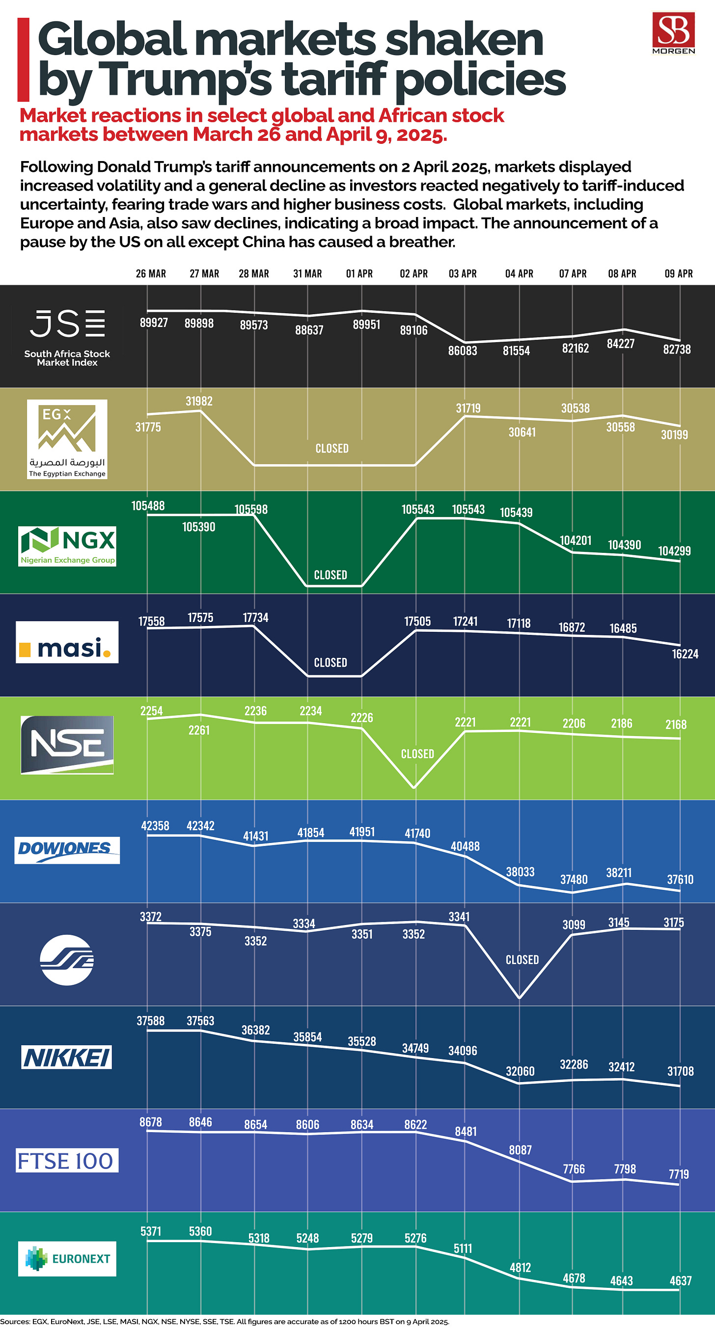 Nigeria's naira strengthened by 0.6% to ₦1,530/USD, driven by the Central Bank's $23 billion forex reserves and improved oil output. However, Nigerian equities plummeted, losing ₦659 billion due to US President Trump's tariff plans.