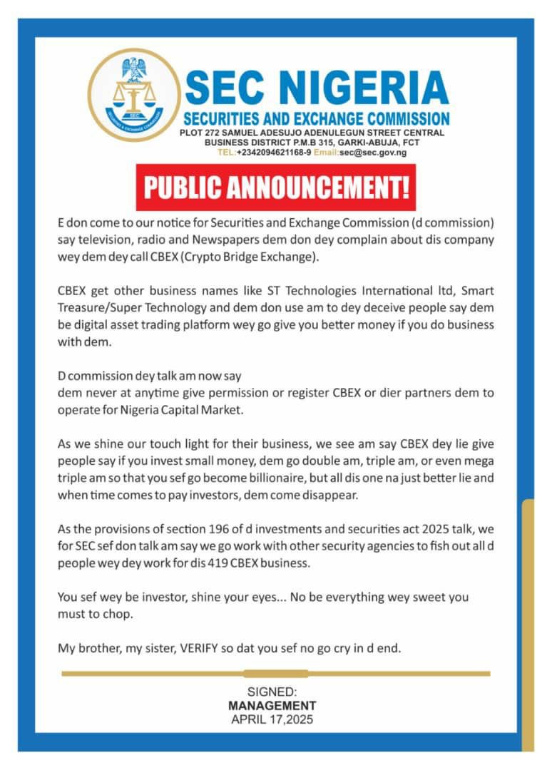 As the sole regulator with statutory authority and technical expertise to assess firms' credentials, the SEC plays a pivotal role. Its oversight ensures market participants meet required standards and maintain robust investor protections. This responsibility has grown increasingly urgent following incidents like the CBEX collapse, where many Nigerians were misled into believing they were using a government-approved platform. The platform's SCUML (Special Control Unit Against Money Laundering) certification created a false impression of legitimacy, despite its complete lack of SEC registration – the only legal authorisation for capital market activities.