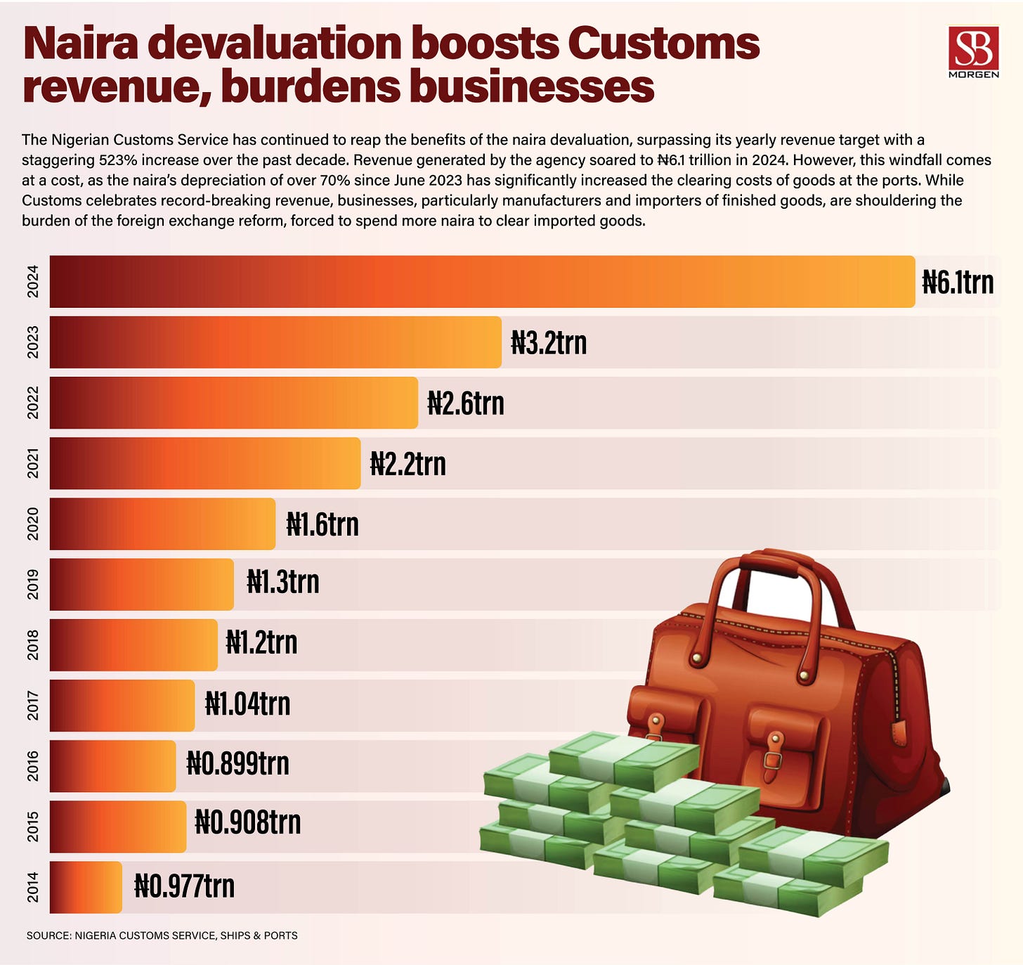 Nigeria's Customs saw revenue collection reach of ₦6.1 trillion in 2024, surpassing its target by 20.2% and representing a 90.4% increase from 2023.