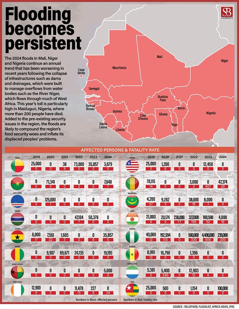 At the end of August, over 290,000 people have been displaced in seven countries: Nigeria, Liberia, Guinea, Côte d’Ivoire, the Democratic Republic of the Congo, the Central African Republic, and Chad. The floods have destroyed or damaged more than 233,000 houses, 61 schools and 13 health facilities — almost quadrupling the number since July — severely disrupting livelihoods and access to essential services. In the latter half of August, 465 people were reported killed and 1,747 injured, while an additional 354,000 hectares of agricultural land were affected, rendering 380,000 hectares unsuitable for agricultural and livestock production. Additionally, an estimated 32,200 heads of cattle have been swept away, bringing the total to 36,400 in 2024. Flooding has become an annual occurrence in this region, with risks exacerbated more by poor drainage and inadequate dam infrastructure than climate change. Nigeria, like many West African countries, is grappling with severe flooding. The recurring devastation highlights Nigeria’s perennial failure in flood management. For instance, approximately 70% of Maiduguri is submerged, displacing thousands of residents. The Nigerian Correctional Service recaptured three inmates after a jailbreak, and 80% of the animals at the Sanda Kyarimi Park Zoo died. Borno State has experienced its most devastating flood in 30 years, largely due to the Alau Dam’s inability to manage overflow. The long-term risk includes a significant challenge to Nigeria’s food security, which is already strained by violence, insecurity, and crises related to storage and foreign exchange. Despite the warnings, there is little evidence of proactive measures to prevent or mitigate the damage. It has become a pattern: floods arrive, displace thousands, destroy homes and farmlands, and leave survivors at risk of disease and hunger. Then, the cycle repeats the following year. Nigeria’s flood risk management suffers from deep-rooted systemic issues. These include weak early warning systems, poor urban planning, and the lack of a coordinated response across government agencies. Moreover, the country’s failure to properly maintain or construct sufficient flood management infrastructure, such as levees and drainage channels, exacerbates the problem. Existing flood-prone zones continue to be neglected, leaving millions exposed to yearly displacement and destruction. For Nigeria to break this cycle, there must be a fundamental shift in policy and culture. Flood risk management must become a national priority, focusing on prevention rather than reaction. This includes developing reliable early warning systems, implementing robust urban planning regulations, and ensuring flood-prone areas are adequately equipped to handle excess water.